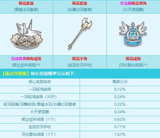 9月23日-11月12日,购买角色经验卡+400,赠送【雨点许愿瓶】,开启即有机会获得:珍宝阁羽毛系列极品【一羽轻鸿座椅/轻羽呢喃/羽舞轻扬套装/大天使翅膀】、互动效果稀有戒指【偌沚垽吟戒指】、极品【雪凝冰羽/白鹭幻羽套装】、极品【金冠恋羽手杖】、极品【羽化登仙戒指】或其他奖励之一!