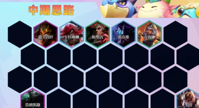 该阵容八人口就可以大成,主要核心就是莫德凯撒的个人表演秀,其他棋子都是羁绊挂架和抗伤的炮灰,如果卡特琳娜能追到三星的话可以当成副核来培养。