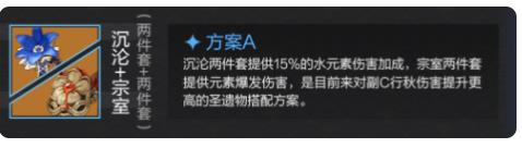 沉沦两件套提供15%的水元素伤害加成,宗室两件套提供元素爆发伤害,是目前来对副C行秋伤害提升更高的圣遗物搭配方案。