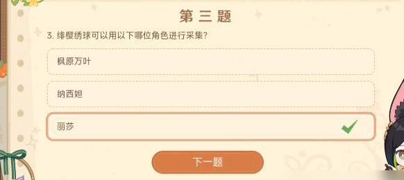 3、绯樱绣球可以用以下哪位角色进行采集?