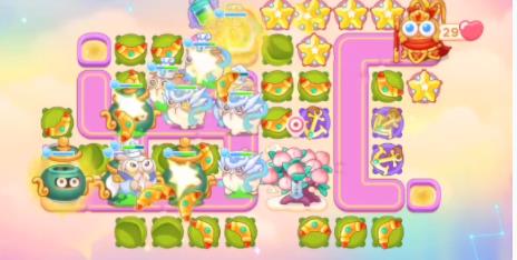 4、后方放置星星,船锚将附近的道具清完就可以打蟠桃树了,开出来的格子放置回旋镖即可。
