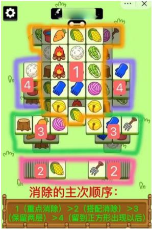 附上重点消除次序,清理到最后的偏僻区域,那些明着最好消除的牌不要轻易使用,留着最后做搭子才能够保证不会卡壳,可以多玩几遍找到规律。