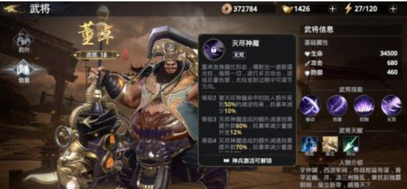 3、董卓:董卓其实是极无双2中比较特殊的一名红将。资质为18的董卓基础战斗力是很高的,不过董卓这名武将贵为18资质红将却没有被动技能,后续也没有提升资质的途径。虽然获得碎片难度不高,一般玩家几周就可以3突甚至5突,战力增长特别快。不过也就是只有这一个优点,一般就放在副将位置,为阵容提供高额战力加持,打架起来放放无双,还是挺顶用的一个红将。