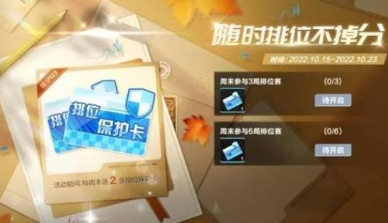 10月15日-10月23日,车手们在周末完成相应任务即可免费领取排位保护卡,每周最多可以获得2张,车手们一定记得要在周末完成任务呦~