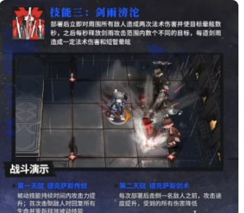 部署后立即对周围所有敌人造成两次法术伤害并使目标晕眩数秒,之后每秒释放剑雨攻击范围内数个不同的目标,每道剑雨造成一定法术伤害和短暂晕眩。
