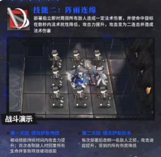 部署后立即对周围所有敌人造成一定法术伤害,并使命中目标在数秒内法术抗性降低,攻击力提升,攻击变为二连击并造成法术伤害。