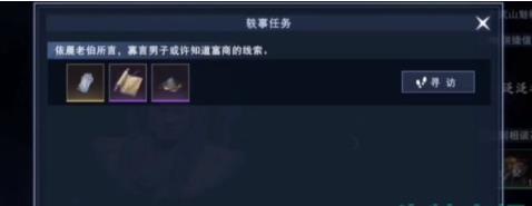 1、进入到游戏打开轶事图鉴找到寡言的男子,点击查看轶事任务:依晨老伯所言,寡言男子或许知道富商的线索,点击寻访;
