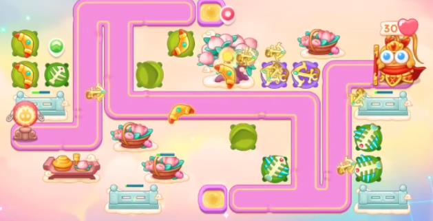 1、本关能够使用的炮塔是:毒针、船锚、回旋镖、雪球塔、鱼刺,我们这一关使用鱼刺船锚回旋镖。
