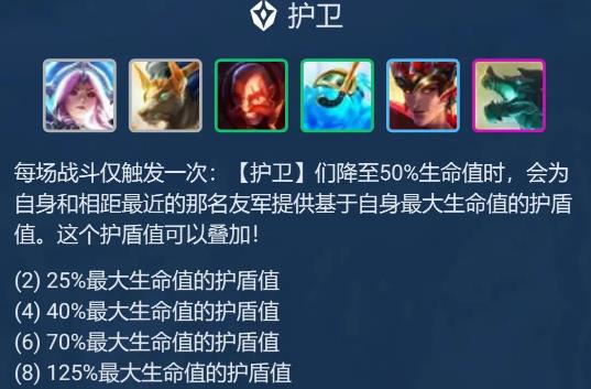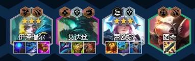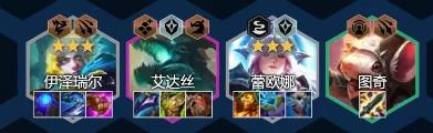 阵容搭配了4护卫,来增强阵容坦度,4护卫下阵容前排可极大增加续航能力,让艾达丝与蕾欧娜都可成为不死小强。另一方面扎克这版本技能增强幅度较高,2星技能可造成较高伤害,可有效帮助EZ过墙。