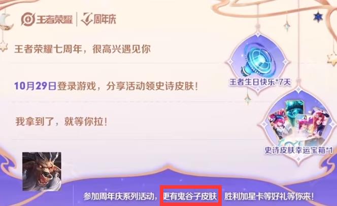 王者荣耀7周年免费皮肤是谁的?王者荣耀这款游戏已经经历了有七个年头,近期王者荣耀就会上线七周年庆的活动,活动爆料也已经上线很久了,按照惯例每年周年庆王者荣耀都会送玩家们一个周年庆限定皮肤作为纪念,很多玩家想要知道这次七周年免费皮肤是什么,所以小编给大家带来了王者荣耀七周年庆免费皮肤的介绍,这次周年庆给到的位置是辅助位,玩家们都知道辅助这个英雄在游戏中也是起到关键的作用,所以官方把这次的皮肤给到了鬼谷子这个英雄,详细的介绍小编已经放在了下方,快来看看吧!