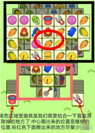 粉色框里面的尽量不要动了,消除黑色里面的结合盲盒消除,楼梯在中间那个位置。