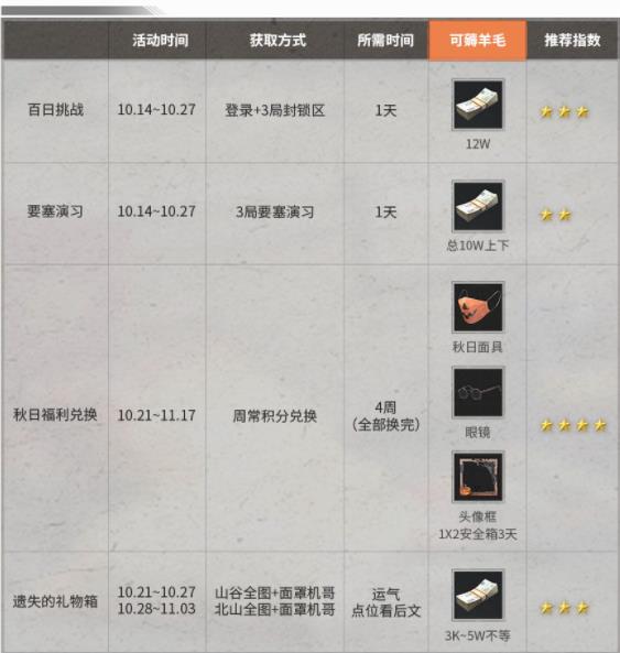 其中遗失的礼物箱一周可以兑换20个箱子,脸不黑的兄弟应该能开出40~50W+的物资,合计有70~80W羊毛可以薅,加上秋日的限定万圣节外观和安全箱,这波活动错过血亏!