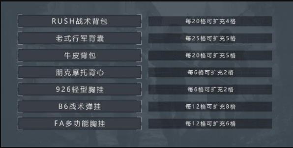 首先使用老式行军包,里面套一个牛皮背包和926轻型弹挂,还能剩余4格空间,牛皮背包里套RUSH战术包,可剩余5格空间,RUSH战术包里套2个B6战术胸挂。总共可用空间为4+8+5+20+20=57格,相较扩充前的30格共扩容27格。
