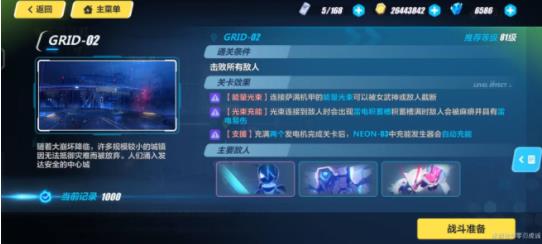 1、天穹霓虹的关卡效果为能量光束,(光束)充能,支援。主要玩法是:关卡内有发生器,女武神可用雷属性攻击对其进行充能,随后发生器会互相形成电弧网,对敌人施加麻痹和易伤效果,增强女武神的输出。而在GRID-02中支援效果有利于充能器更快的充能。(注意关卡限时)