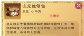2.维修材料放入维修包之后就不能取出来了,而且道具是绑定道具,不能与其他玩家交易。