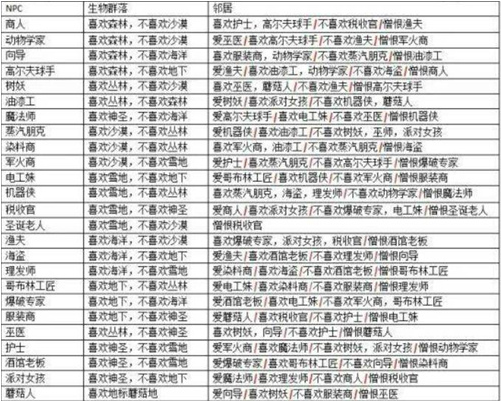 泰拉瑞亚npc喜好什么?泰拉瑞亚是一款超高自由度的沙盒游戏,喜欢沙盒游戏的小伙伴想来都玩过,像素风格看起来也特别的简单明了。玩家可以在游戏里面挖掘、战斗、探索、建造、收集各种资源制作东西,体验制作和冒险寻宝的快乐。在冒险途中可能会遇到跟多NPC,他们有不同的性格和职业,喜欢的东西也是都不一样的,如果想要知道他们喜欢什么,在游戏里慢慢探索是非常困难的。今天小编为大家整理了一份最新统计的所有NPC喜欢的和不喜欢的,希望能够帮助大家。
