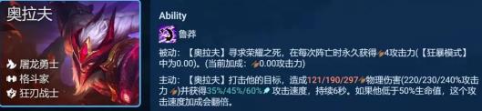 另一方面阵容还给奥拉夫开4狂战羁绊本,每次普攻奥拉夫都可提升1.5-2.75倍伤害,搭配奥拉夫自身技能的增加攻速,可极大输出效率极高,开启技能基本3刀一个脆皮。