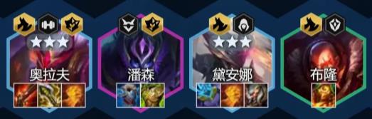这是一套纯暴力输出阵容,阵容属于双C阵容。羁绊搭配上主要依靠屠龙来给奥拉夫与黛安娜带来的高额增伤,让奥拉夫与黛安娜的输出强度大增,特别是黛安娜开局跳后,一套技能下可轻松秒掉敌方脆皮C位。
