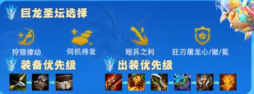 符文方面狩猎律动(极大增加续航能力)、伺机待发(极大增加法强与攻击力)、短兵之力(增加攻击力)狂刃/屠龙心/徽/冕最优。