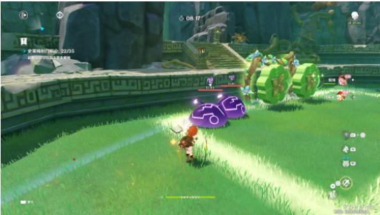 1、可莉或烟绯利用重击/普攻踢雷史莱姆(史莱姆不会攻击玩家)将其射入「藤蔓球门」获得积分(35分通关)