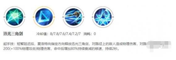 起手技:短暂延迟后,夏洛特向指定方向释放迅光三角剑,对路径上的敌人造成物理伤害,对路径上的敌人造成200(+100%物理攻击)物理伤害,命中后增加80%持续衰减的移速,持续2秒。