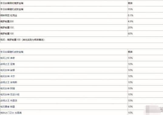 冬日白雪限时魄罗宝箱,打开20次至少掉落2个冬日白雪随机皮肤宝箱。冬日白雪随机皮肤宝箱概率始终为15%。