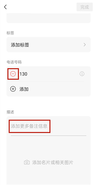 3、将电话号码粘贴到描述里后,点击电话前面的减号后,点击完成即可。