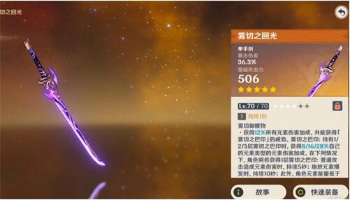 最后就是单手剑中的神器-黎明神剑,虽然90级的面板只有401的攻击力,但是被动可以提高46.9%的暴击伤害,同时当角色生命值高于90%,可以获得28%的暴击率【5阶】,因此只要给神里绫人准备钟离这样的护盾角色,基本上能全程时限28%暴击率的覆盖,虽说面板攻击较低,但是三星武器能有这样的效果也很不错了。