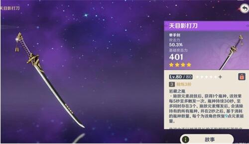 其次是天目影打刀,作为神里绫华的下位武器,主属性攻击力,90级面板454【略低】,但是能够提高55.1%的攻击力,被动与元素充能有关,比较适合大招流的角色,神里绫华依赖大招可以实现无缝循环,至于神里绫人,由于目前主要的输出技能是E技能,这把武器也仅仅是在没有选择的情况下用到。